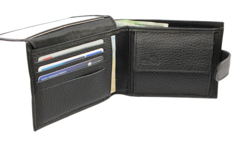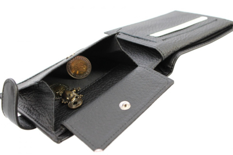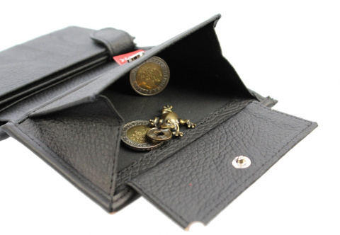 - duża praktyczna kieszeń na bilon, zapinana na nap, bez prześwitów w dolnych rogach - co zapobiega gubieniu zawartości; kieszeń odchyla się na tyle daleko, że nie ma problemów z wyciąganiem bilonu