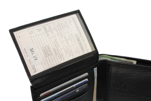 - wewnątrz znajduje się dodatkowe skrzydełko z miejscami na dokumenty: 8 miejsc na dokumenty formatu ID (karta płatnicza / kredytowa, d. osobisty itp.) + jedno przezroczyste miejsc na duże dokumenty typu d. rejestracyjny 10 x 7 [cm] wykończone folią