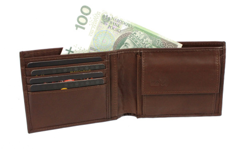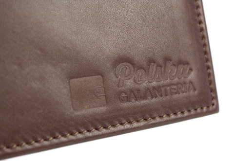 Poziomy portfel męski od firmy PolskaGalanteria. Wyrób jest uszyty z wysokiej jakości skóry cielęcej, w klasycznej stylistyce, która od lat cieszy się dużym zainteresowaniem klientów. Składany na dwie części portfel męski, ma dodatkowe skrzydełko z przezroczystym miejscem na dokumenty większego formatu, takie jak dowód rejestracyjny. W pozostałych schowkach zmieszczą się dowód osobisty i prawo jazdy, a także rozmaite karty płatnicze. Te ostatnie są wyjątkowo bezpieczne w skórzanym portfelu, ponieważ został wykonany tak, by chronić je również przed przypadkowym zeskanowaniem. Zabezpieczenie RFID skutecznie uniemożliwia tę czynność złodziejowi. Praktyczna kieszeń na bilon jest zapinana na napę, a podwójny schowek na banknoty, po rozłożeniu portfela ma wymiary 24 x 9 cm. Całkowite wymiary złożonego portfela to: 12 x 10 x 2 cm.