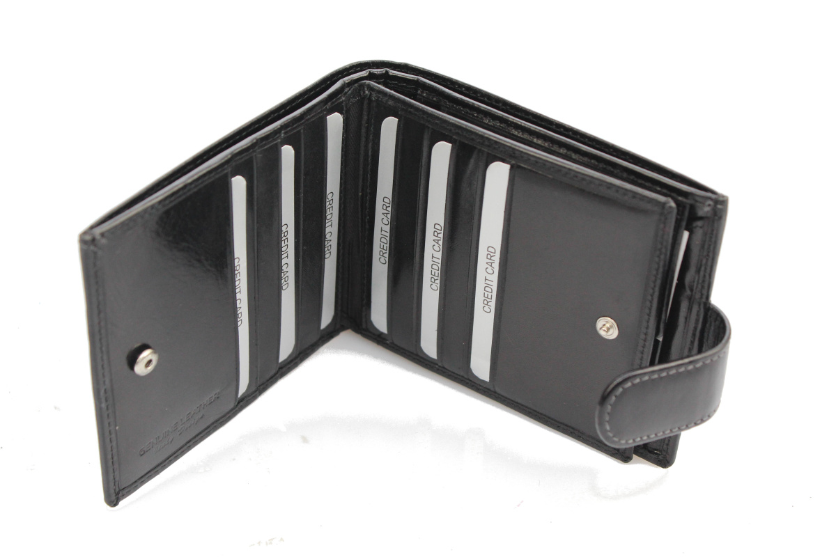 - portfel składa się w stylu "książkowym" i jest zamykany zewnętrzną zapinką z napem