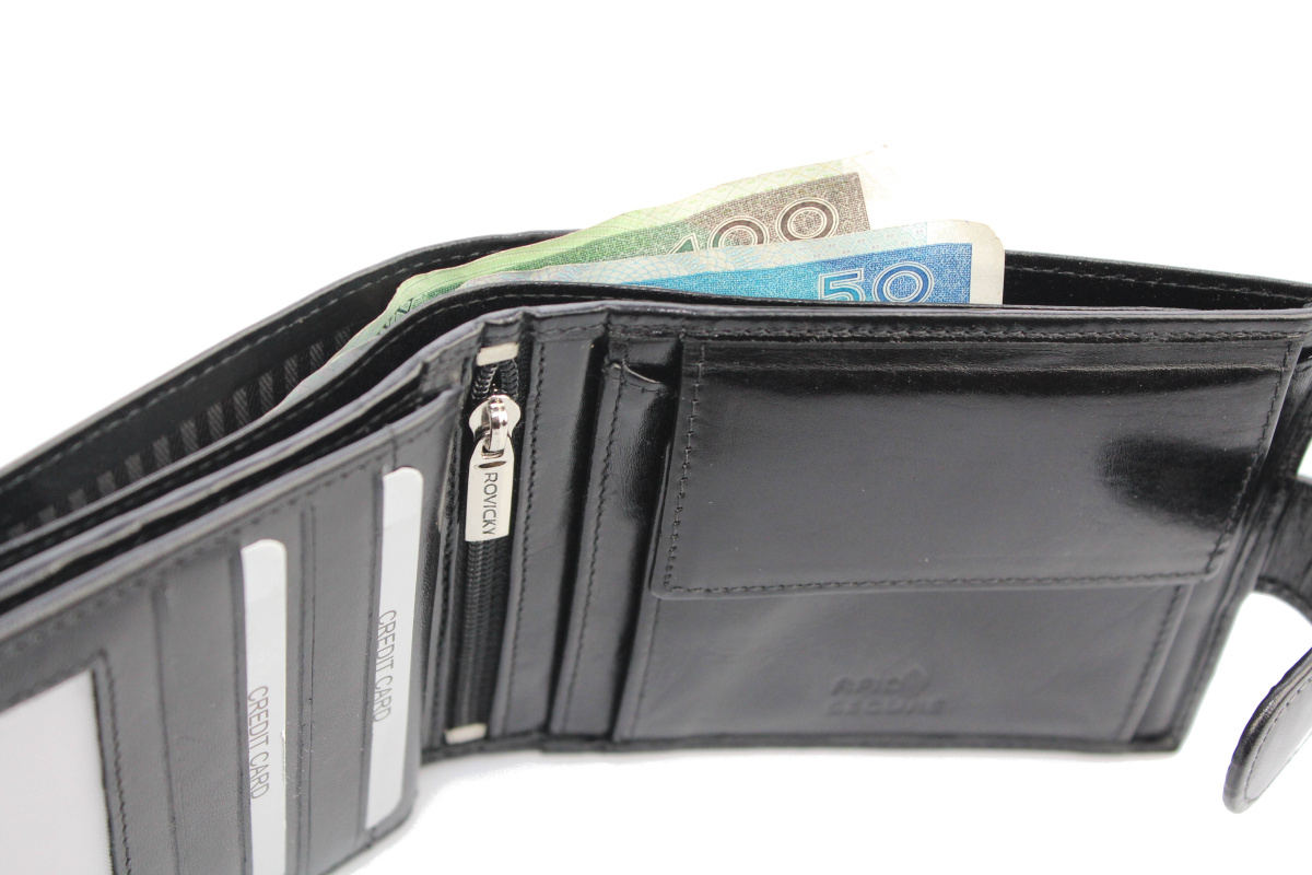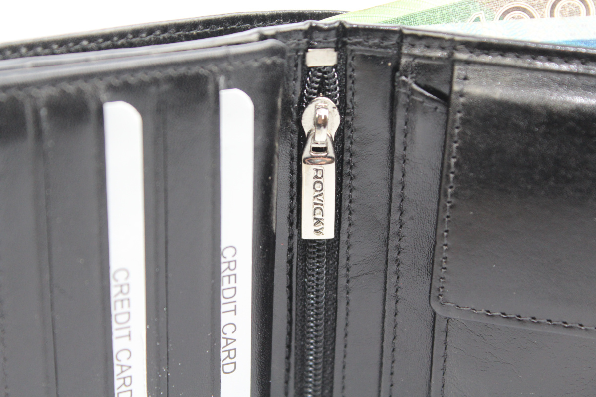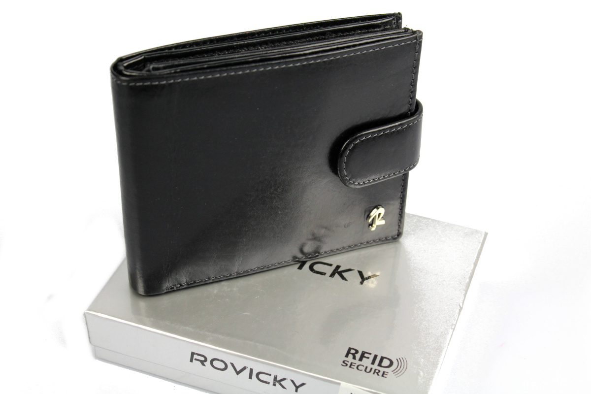 W wyrobach galanteryjnych cenisz sobie jakość i wysokogatunkowość? Chcesz wyciągając portfel, czuć się wyjątkowo, elegancko i dostojnie? Takie doznania zapewni Ci duży poziomy model męski Rovicky wykonany z naturalnej, skóry licowej. Jego funkcjonalność i walory wizualne wzbogacone zostały o niezwykle przydatne zabezpieczenie RFID, które uniemożliwia zeskanowanie kart płatniczych np. w autobusie, barze czy restauracji. Jest to szczególnie ważne, gdyż mężczyźni najczęściej noszą portfele w tylnej kieszeni spodni, a to daje możliwość potencjalnemu złodziejowi na szybką i bezproblemową kradzież. Zapewnij sobie ochronę z praktycznym portfelem dostępnym w sklepie PolskaGalanteria.