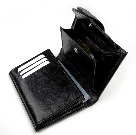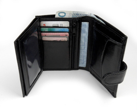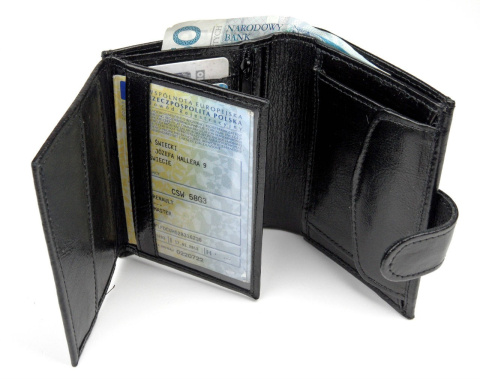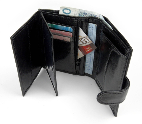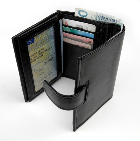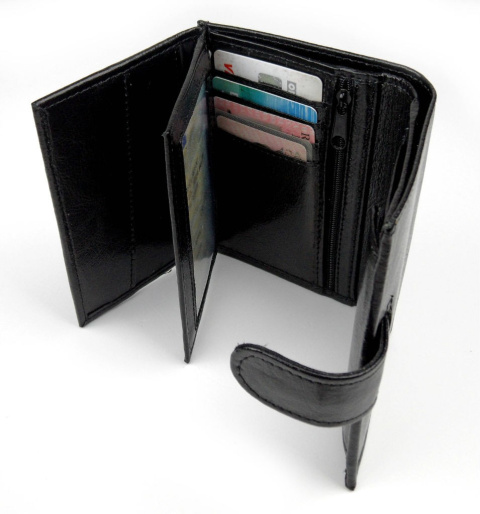 - portfel składa się w stylu "książkowym" i jest zamykany zewnętrzną zapinką z napem