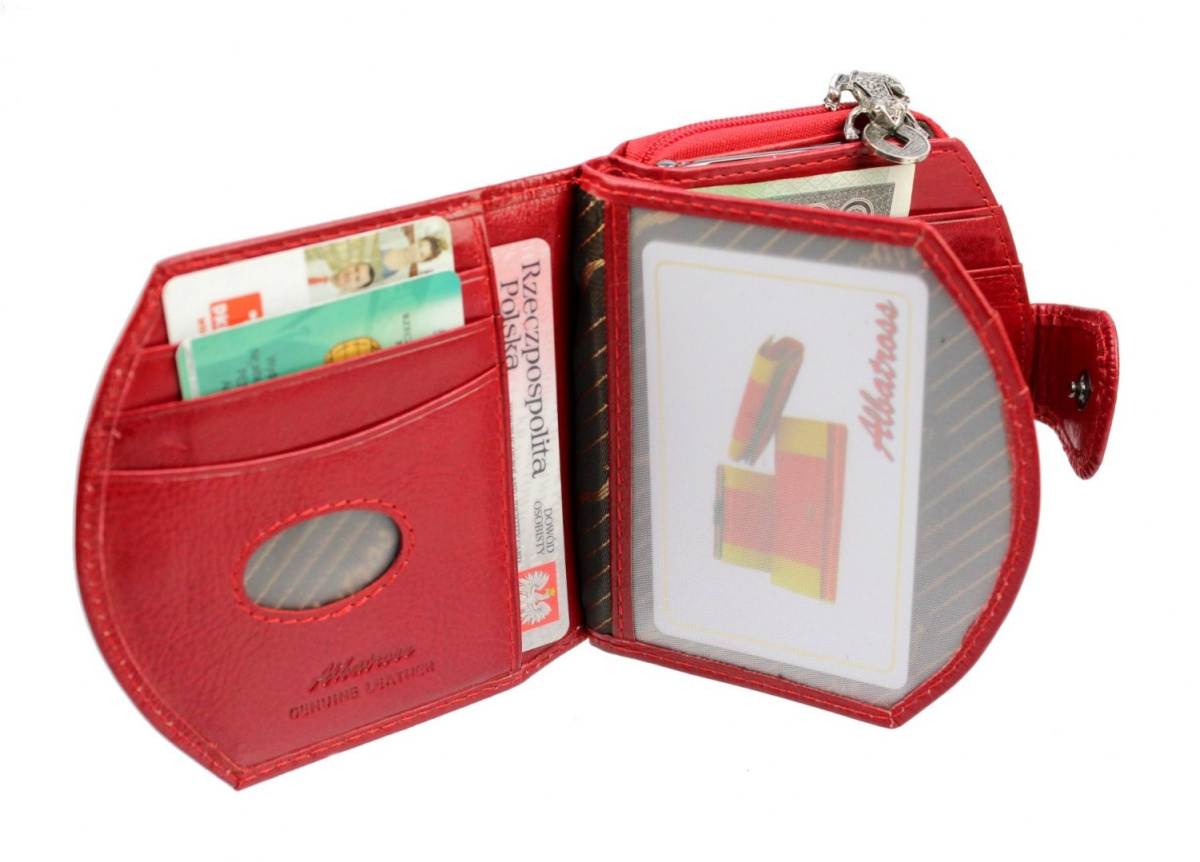 Czerwony, półokrągły portfel bułeczka marki ALBATROSS wykonany został z licowej skóry naturalnej, której użycie gwarantuje zachowanie walorów wizualnych i estetycznych na długie lata. Ten niewielki, poręczny portfelik wzbudza wśród pań niebywale duże zainteresowanie z uwagi na prezentowaną praktyczność i format mieszczący się zarówno w małej torebce, jak i kieszeni. Wewnątrz wyrobu znajduje się część na banknoty zapinana na napę, kieszeń na bilon bez prześwitów w dolnych rogach oraz 3 miejsca na dokumenty formatu ID takie jak dowód osobisty, prawo jazdy i karta płatnicza. Mimo niewielkich rozmiarów 11x3x10,5 cm w portfelu od ALBATROSS zmieścisz wszystko, co trzeba.