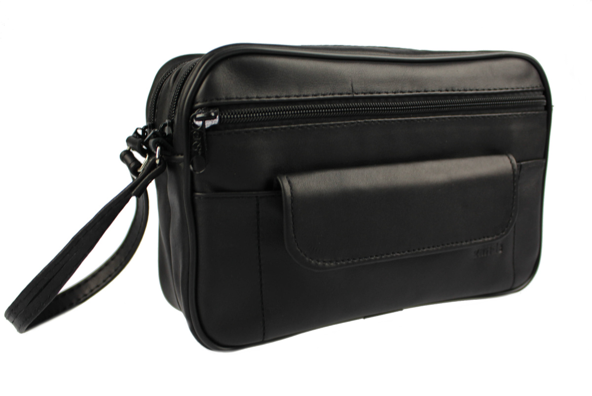 Męska saszetka wykonana w całości ze skóry naturalnej, z wygodnym uchwytem. Duży model, wyposażony w dwie duże komory, które znajdują się na górze saszetki. Po obu stronach saszetki dostępne są trzy schowki (dwa zapinane na solidny suwak oraz jedna zapinana na mocny zatrzask/nap)