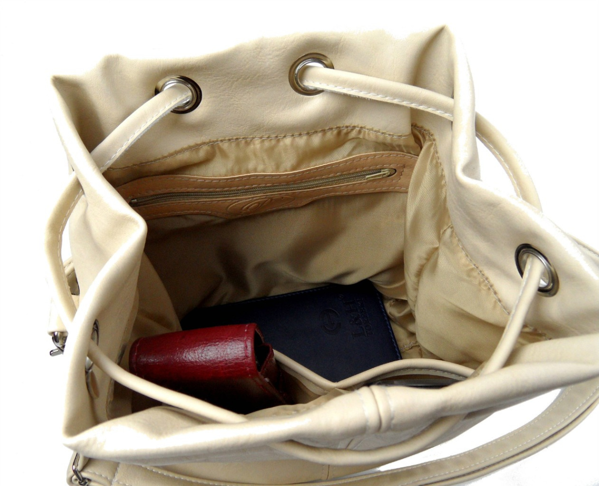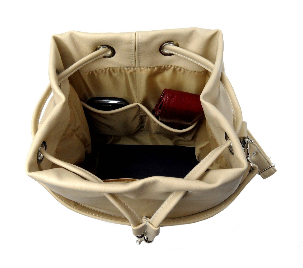 - Główna komora torebki zapinana na ściągany sznurek.
