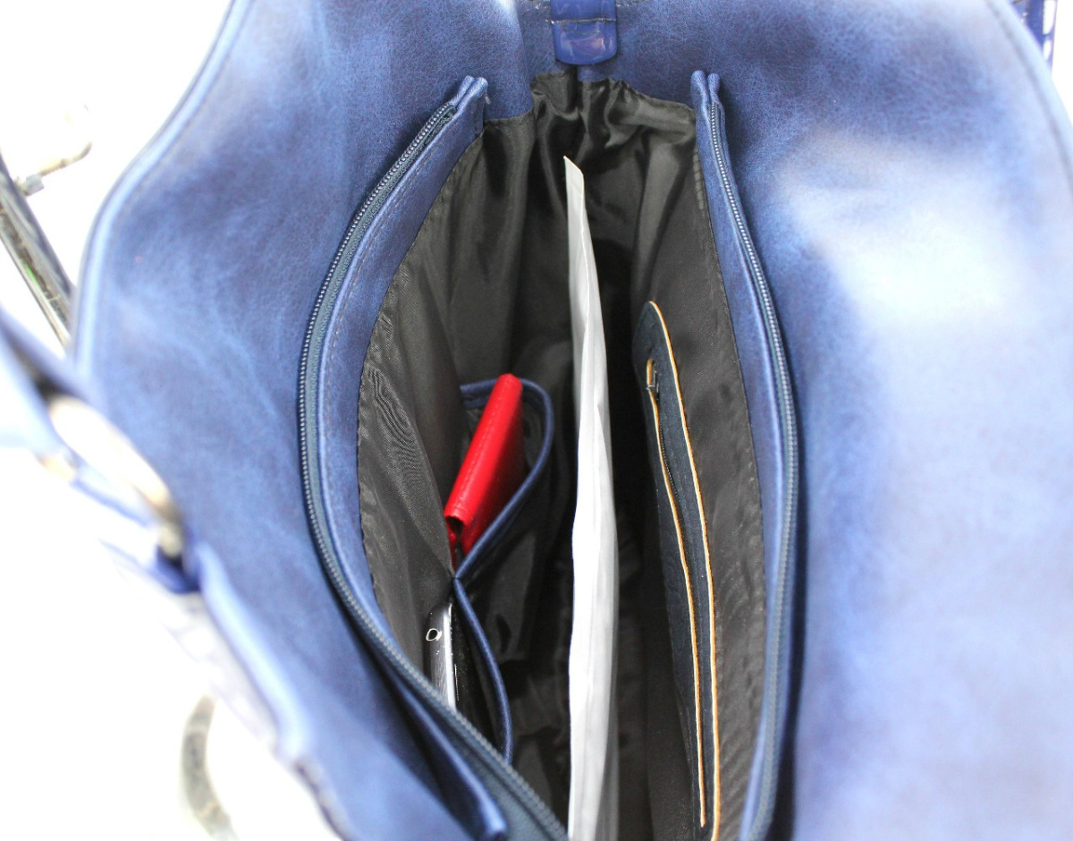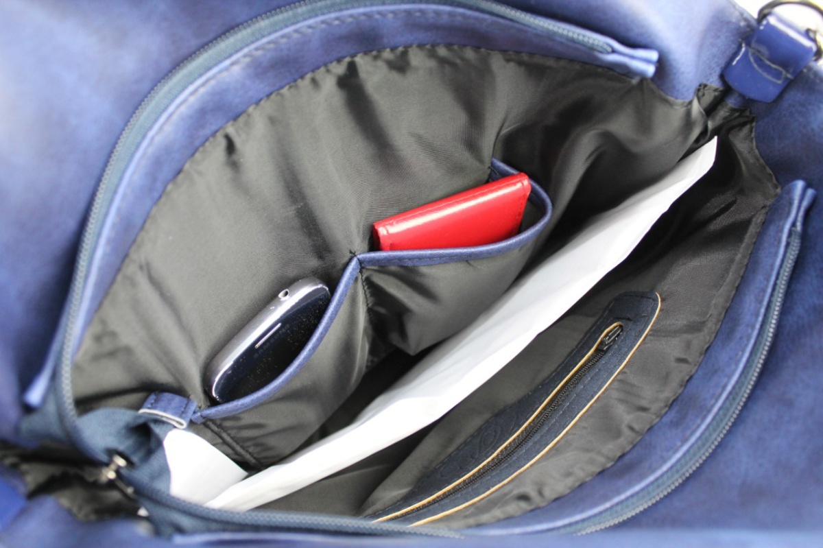 - Wewnątrz torebki znajduje się jedna główna komora, w której na boku wydzielona jest zapinana na suwak kieszonka na dokumenty oraz otwarta kieszonka na telefon