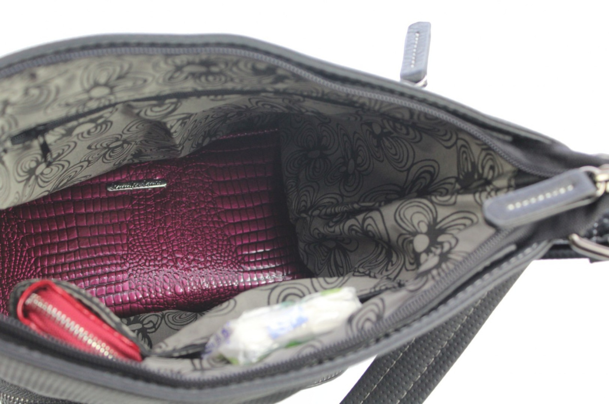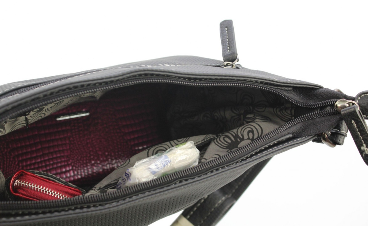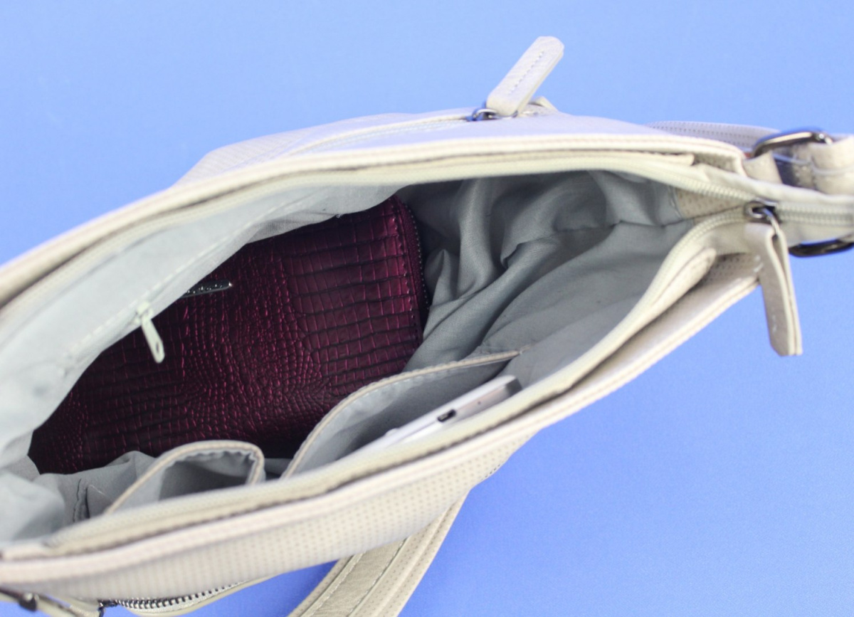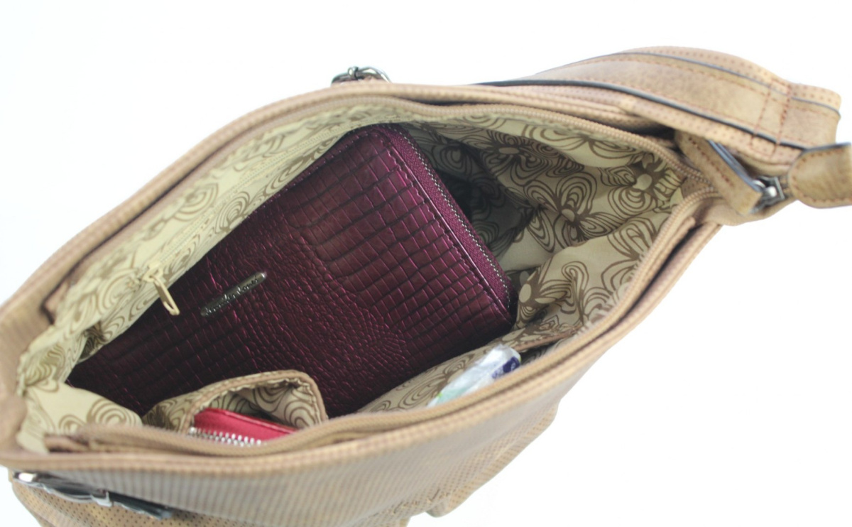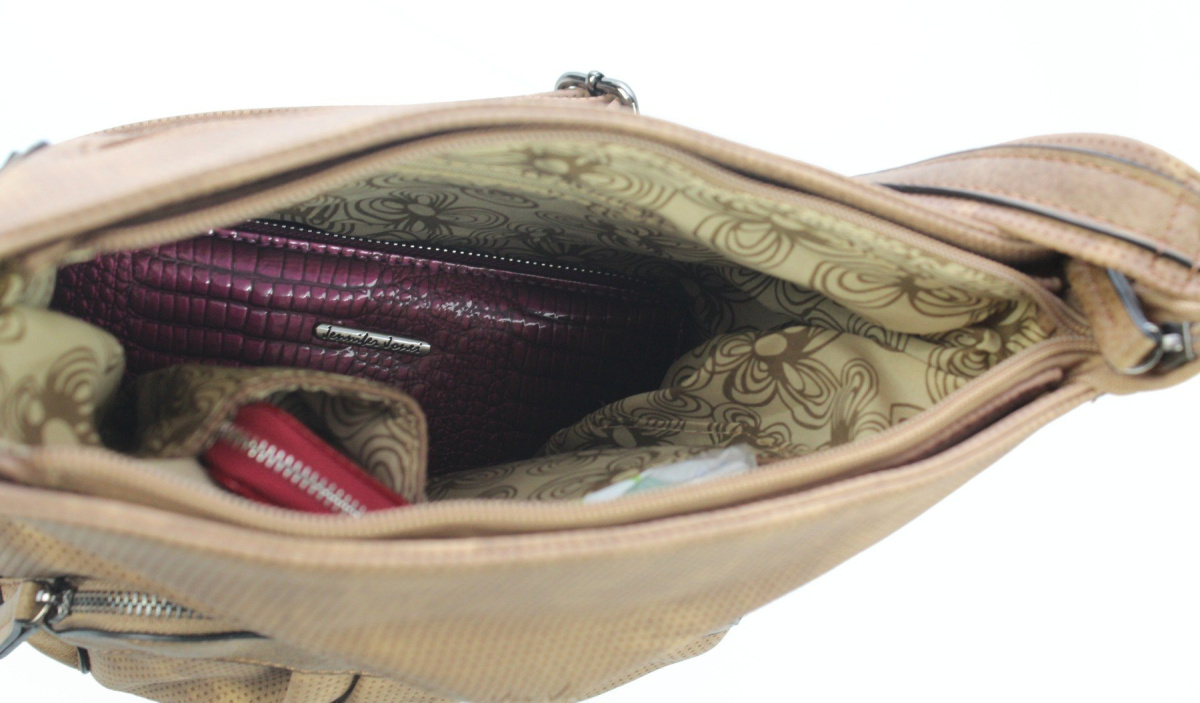 - Wewnątrz torebki znajduje się jedna duża komora z wydzieloną zapinaną na suwak kieszonką na dokumenty oraz kieszonką na telefon komórkowy.