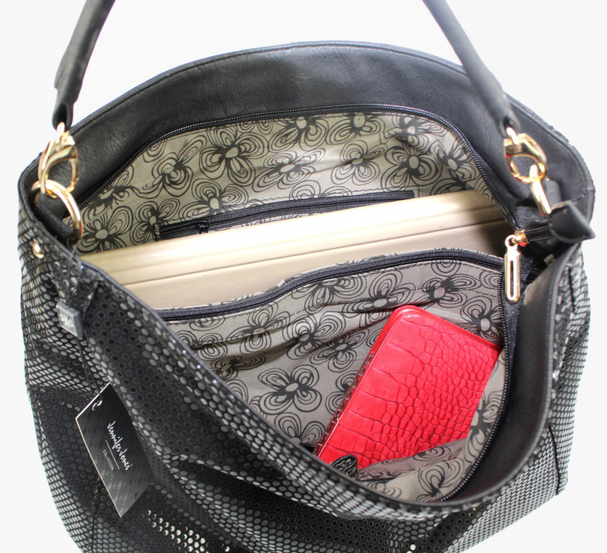 Na przodzie torebki znajdziemy 2 nie zamknięte schowki o jednakowym wymiarze 18 x 20 [cm] w największych punktach