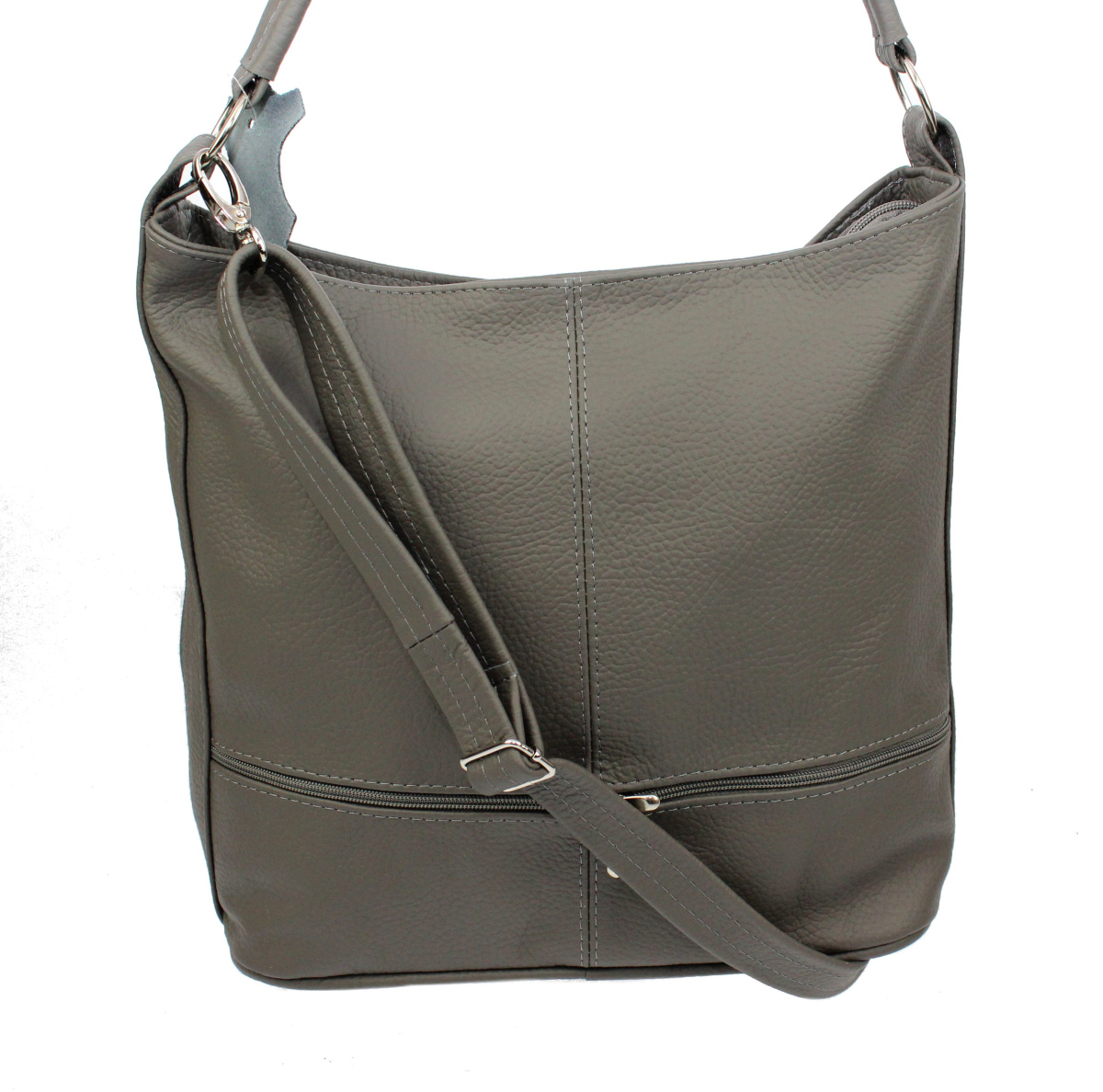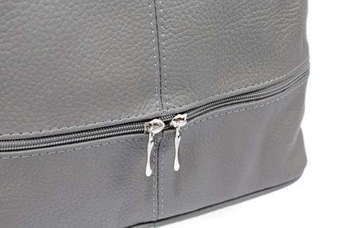 Torebka AŚKA to wytrzymały model, który został uszyty ze skóry naturalnej. Brak łączeń klejonych wpływa na estetykę jej wykonania, a także trwałość. Naturalna skóra w odcieniu grafitowo-beżowym sprawia, że jest ona niezwykle odporna na uszkodzenia i zarysowania w trakcie użytkowania. Torebka od producenta MAGRE posiada jedną główną dużą kieszeń zamykaną na suwak, wyposażoną w dodatkowe dwie mniejsze kieszonki, jak także trzy zewnętrzne kieszenie, jedna z tyłu i dwie z przodu. Przez co jest ona niezwykle pojemna, a zarazem zgrabna. Okrągłe wzmacniane dno zapobiega jej deformacji w trakcie użytkowania. Torebka wyposażona jest w dwa paski - jeden krótszy o długości 50 centymetrów, dedykowany do noszenia torebki w klasyczny sposób w ręce, oraz dłuższy z możliwością regulacji od 60 do 120 centymetrów do przewieszania torebki przez ramię.