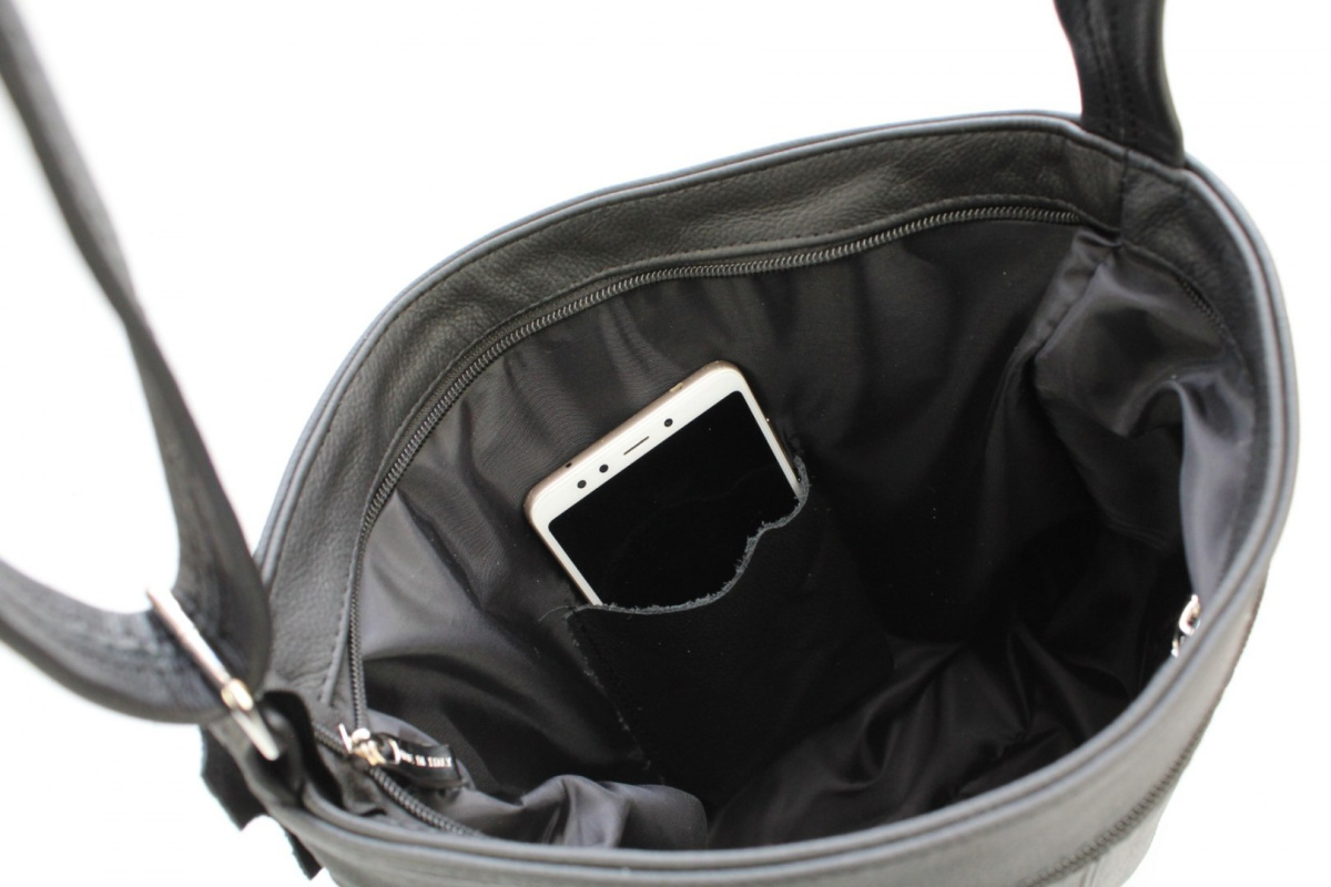 - Wewnątrz torebki znajduje się jedna duża komora z wydzieloną zapinaną na suwak kieszonką na dokumenty oraz kieszonką na telefon komórkowy