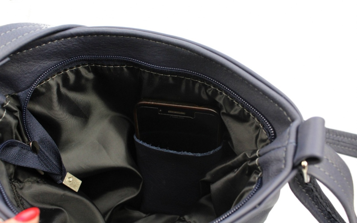 - Wewnątrz torebki znajduje się jedna duża komora z wydzieloną zapinaną na suwak kieszonką na dokumenty oraz kieszonką na telefon komórkowy