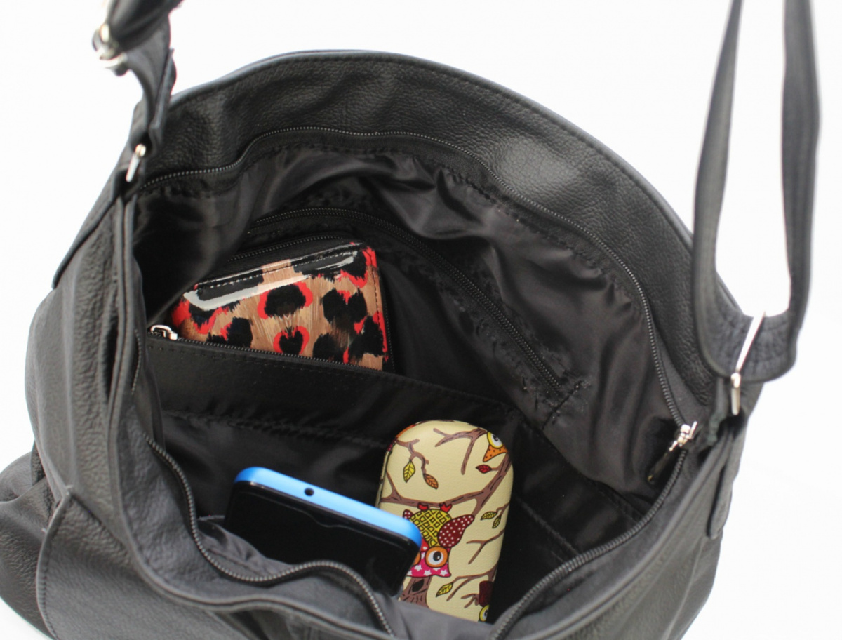 - Wewnątrz torebki znajduje się duża komora, zapinana na suwak, po bokach znajdują się: zapinana na suwak kieszonka na dokumenty oraz kieszonka na telefon komórkowy