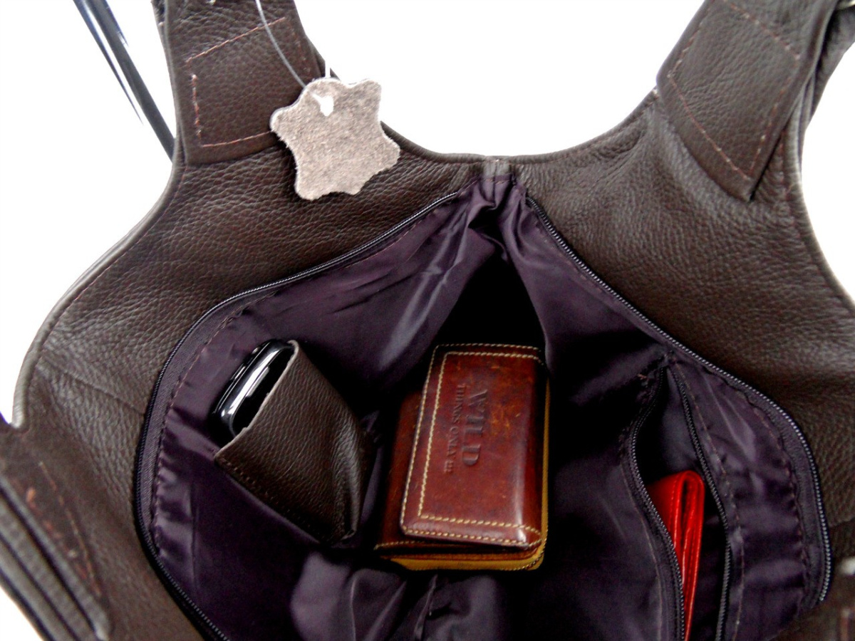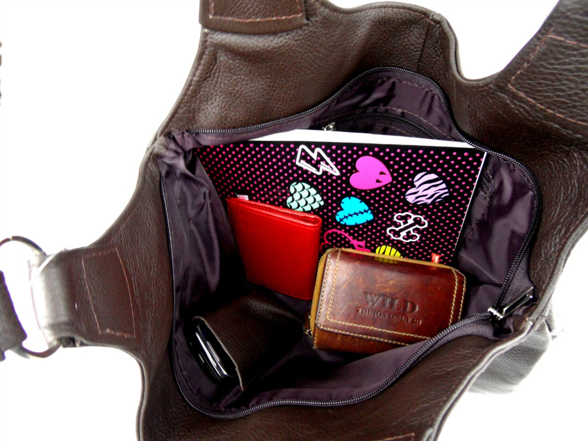 Posiada jedną główną komorę wewnątrz zamykaną na solidny suwak.W której mieści się podręczny schowek na suwak oraz jedna kieszonka na telefon komórkowy.Pomieści również teczki w formacie A4. Torebka posiada dwie rączki , które umożliwiają wygodne noszenie na ramieniu ,w dłoni i przedramieniu. Na zewnętrznej tylnej części znajduje się podręczny schowek zamykany na solidny suwak.