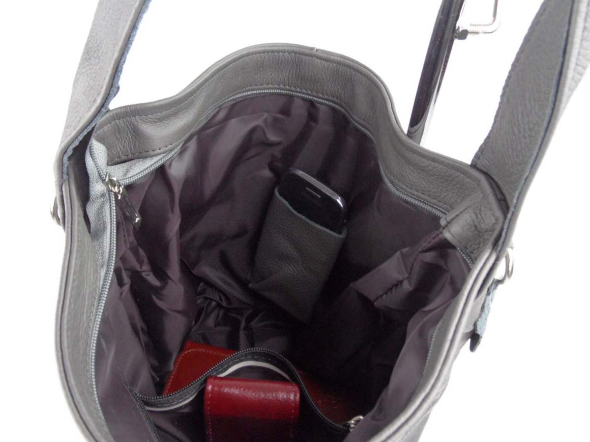 - Wewnątrz torebki znajduje się jedna duża komora z wydzieloną zapinaną na suwak kieszonką na dokumenty oraz kieszonką na telefon komórkowy