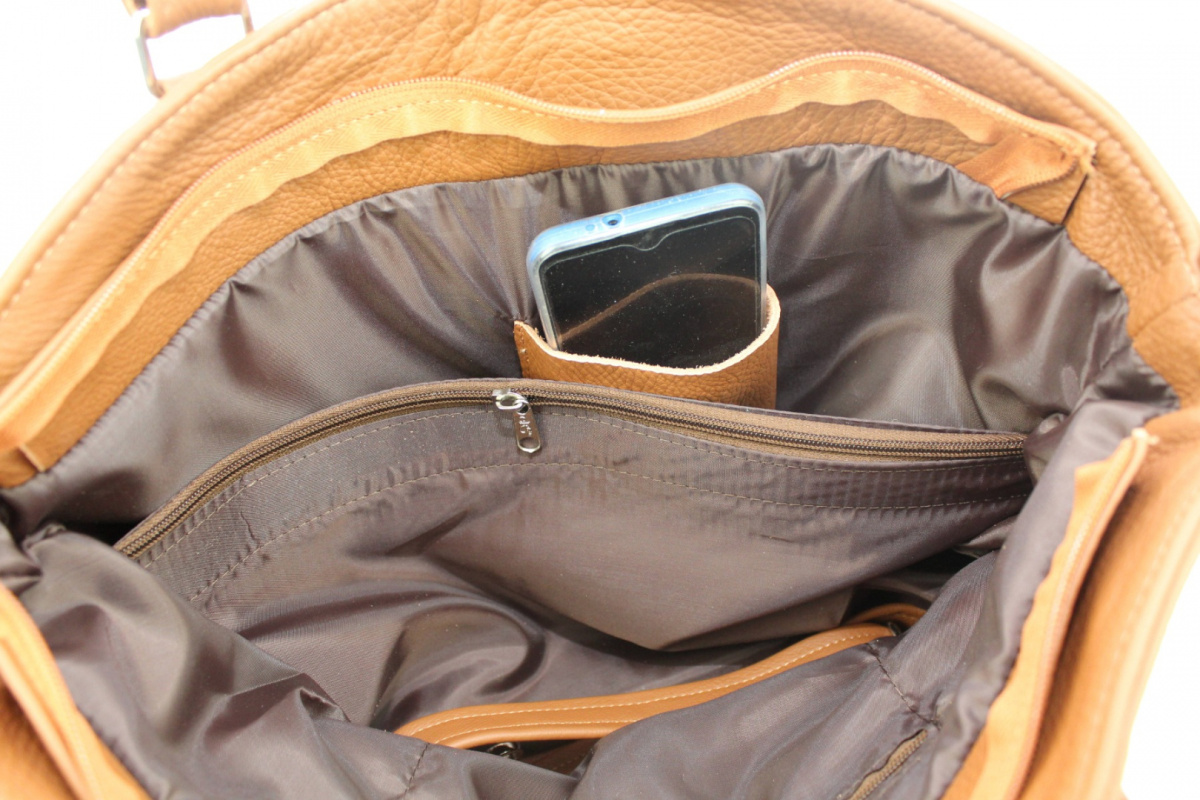 - Wewnątrz wydzielona jest zapinaną na suwak kieszonka na dokumenty oraz kieszonka na telefon komórkowy