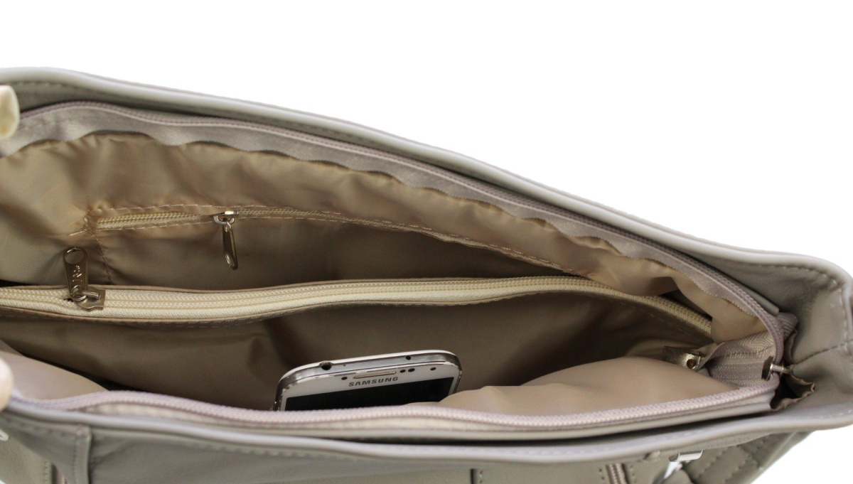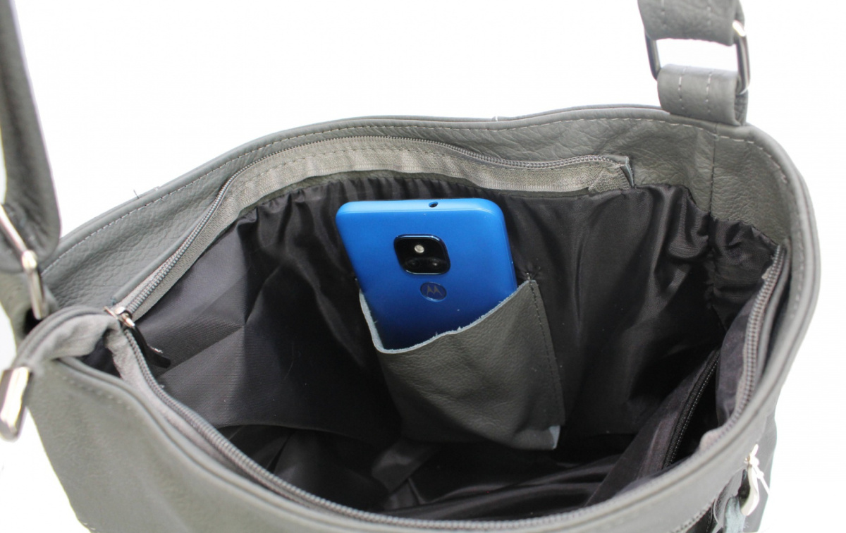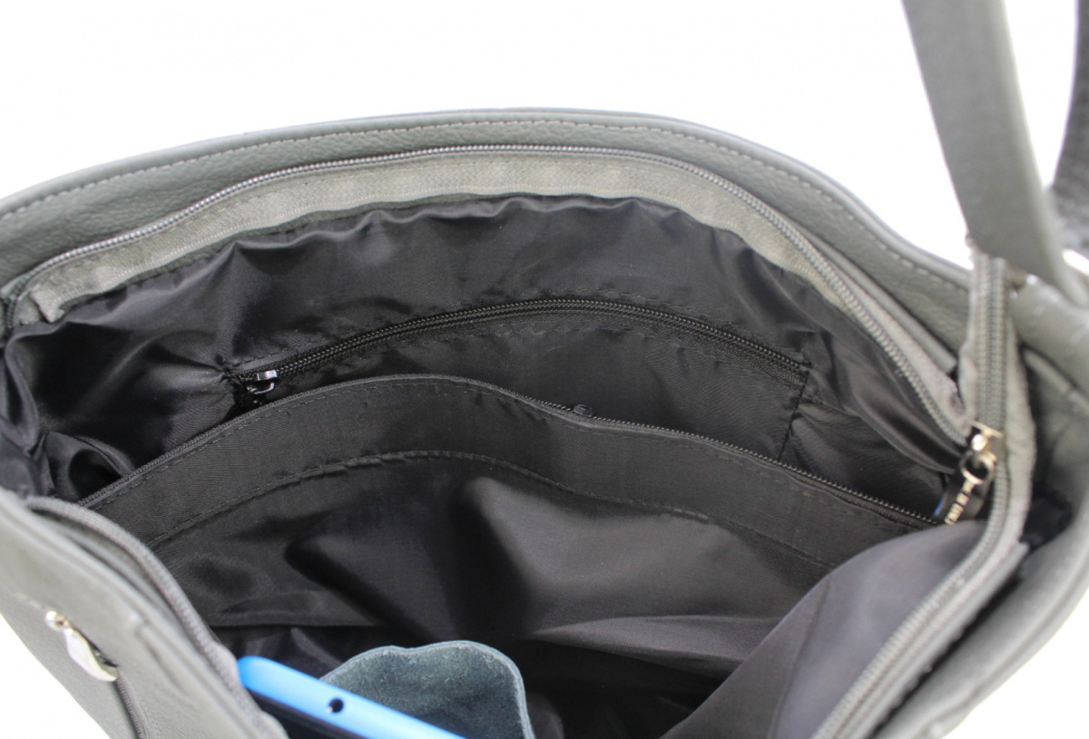 - W środku torebki znajduje się również zapinana na suwak kieszonka na dokumenty oraz kieszonka na telefon komórkowy.