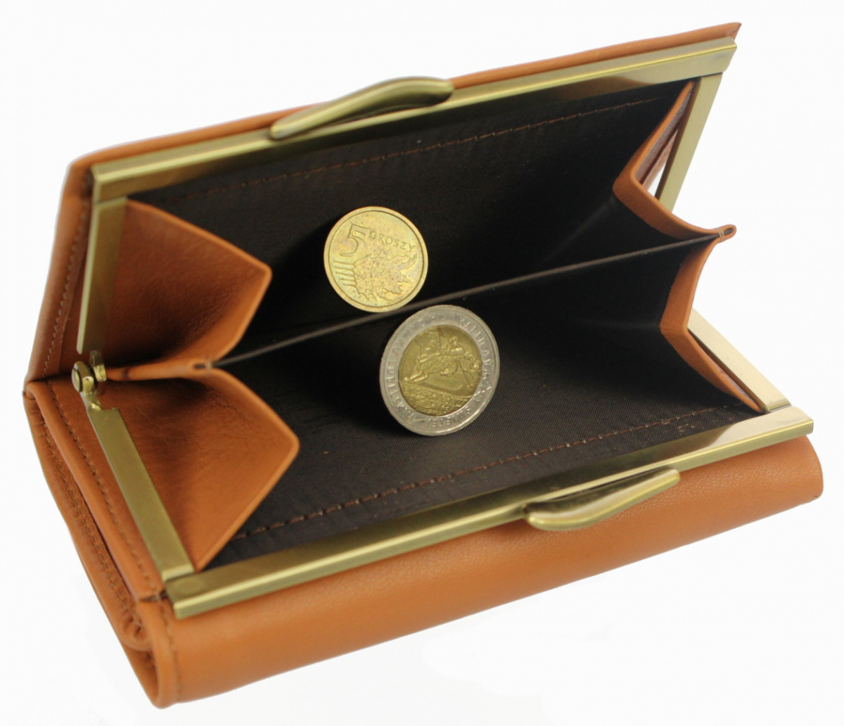 Z ciepłym odcieniem łączy się złoty bigiel, na który zamykana jest kieszeń na bilon. Druga część jest z kolei zamykana klapką z napą. W jej wnętrzu znajdziesz składaną, pojemną kieszeń na banknoty, a także miejsce na karty o formacie ID (jest ich pięć), okienko na zdjęcie oraz aż cztery dodatkowe schowki na większe dokumenty. Przydadzą się także wtedy, gdy musisz wziąć ze sobą znaczną ilość gotówki.